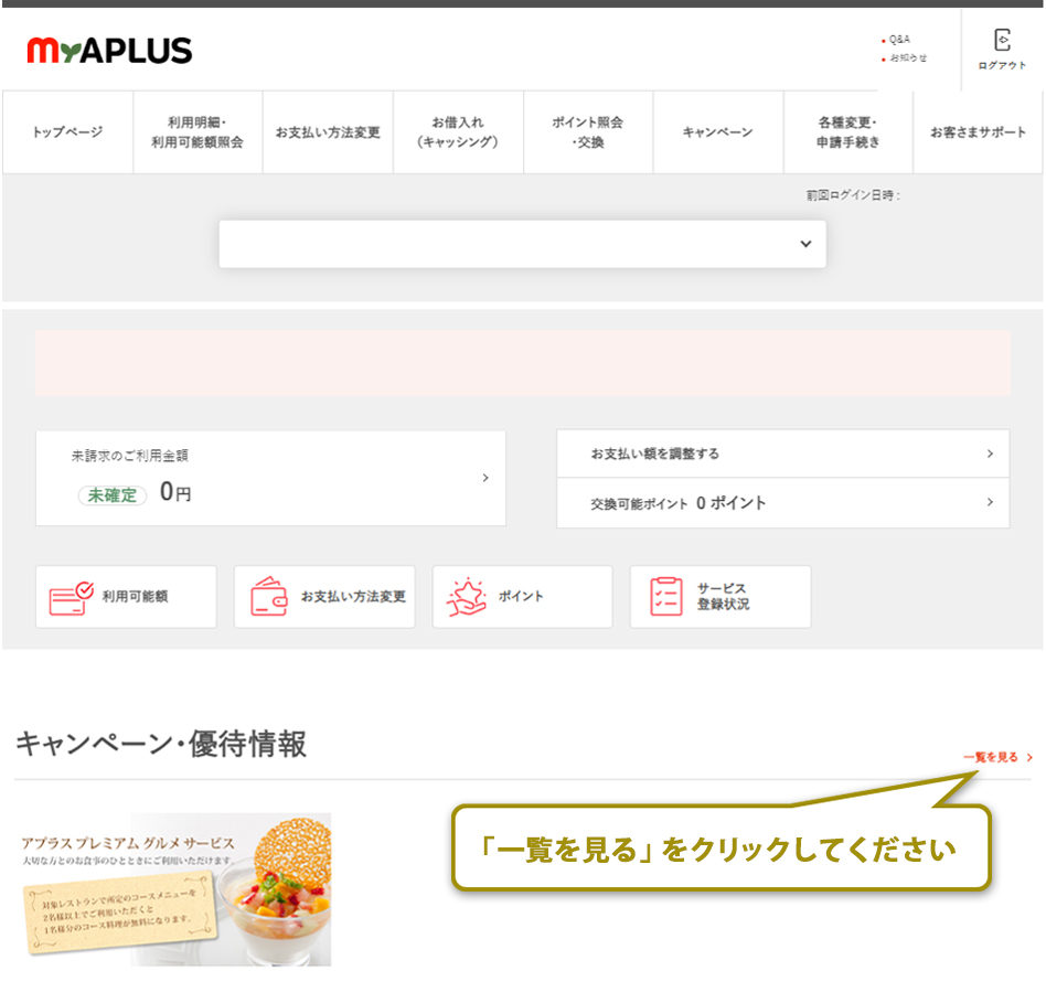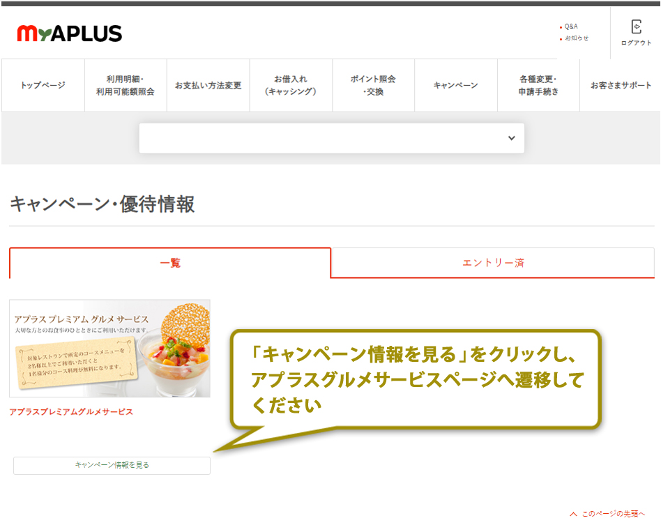 1.クレジットカード会員様専用WEBサービス「My APLUS」へログインのうえ、TOP画面からキャンペーン・優待情報(一覧を見る)へ進み、アプラスプレミアムグルメサービスをクリック後に予約専用サイトへアクセスしてください。