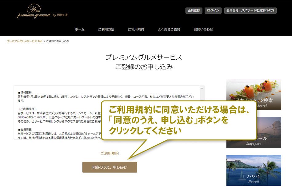 3. 「ご登録のお申し込み」ページから、ご利用規約をお読みいただき、同意いただける場合は「同意のうえ、申し込む」ボタンをクリック。