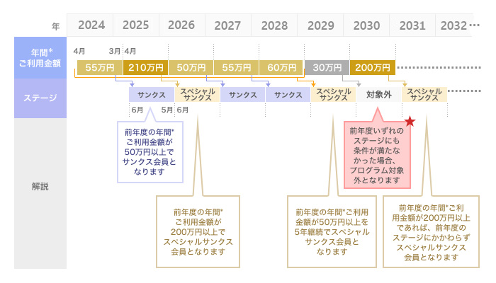 - *年間ご利用金額とは、4月から翌年3月までのご請求分をいいます。詳しくはステージの決まり方をご確認ください。