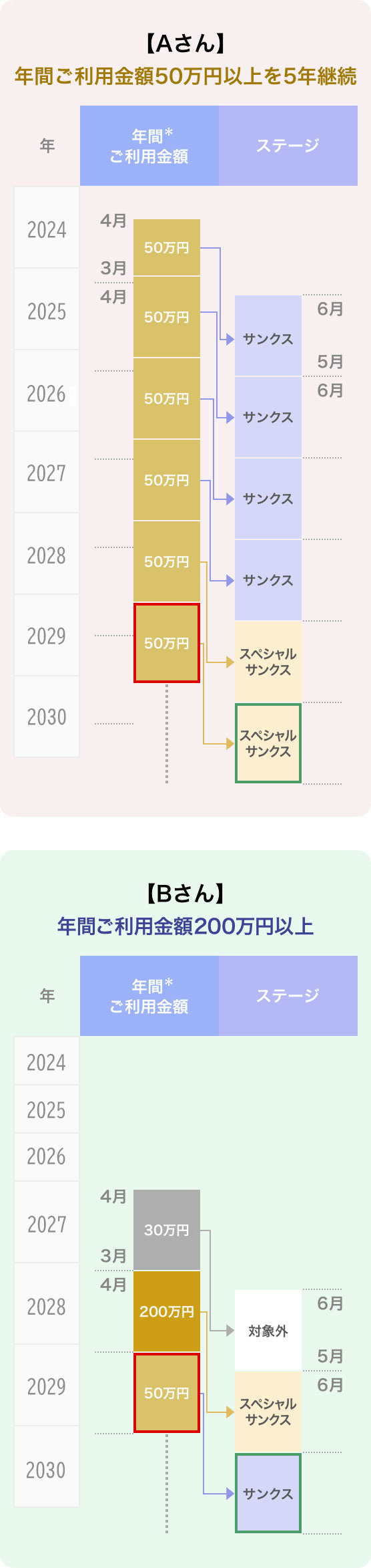 - ※当年(赤枠)の年間ご利用金額*が同じ50万円であっても前年までの年間ご利用金額*により翌年適用されるステージ(緑枠)が異なる場合があります。