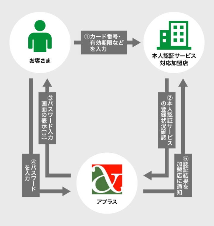 本人認証サービス対応加盟店でインターネットショッピングをご利用する際に、お客さまと加盟店との通常のお取り引きに加えお客さまがアプラスカード会員ご本人様であることをアプラスが確認いたします。
