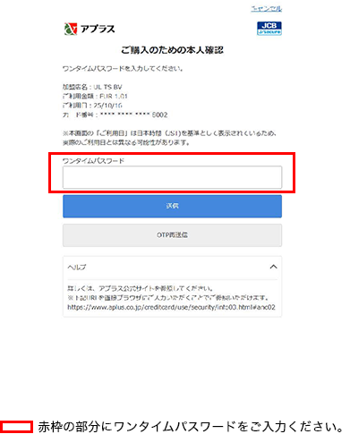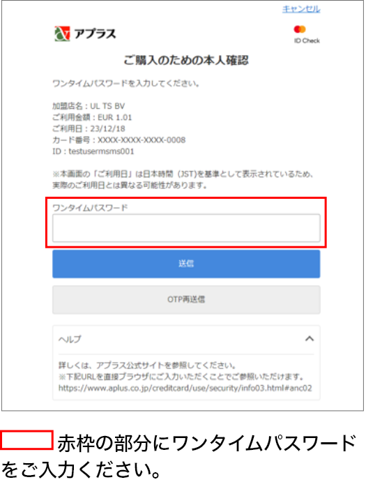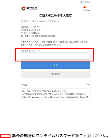 - ・ワンタイムパスワードを正常に入力することなく一定期間が経過したり、認証画面を閉じた場合、お取引は失敗となり、お買い物は成立いたしません。