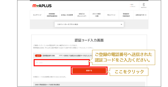 携帯電話番号のご登録があるお客さま:「携帯電話番号」へSMSで認証コードを送信します。