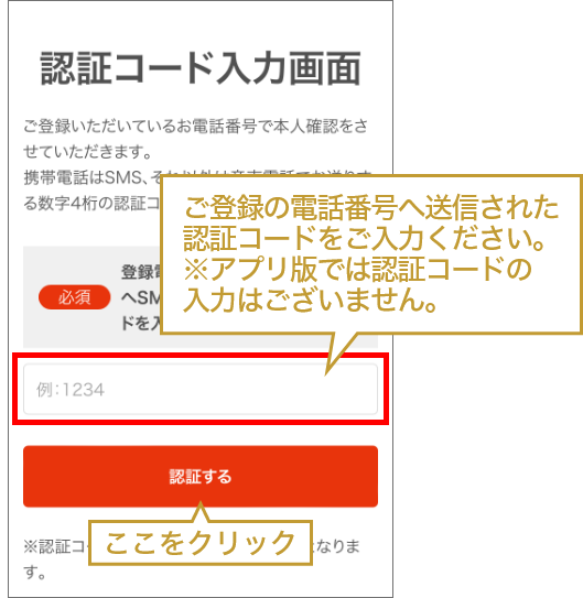 お客さまご本人様からの申し込みであることを確認させていただくために、お客さまのご登録電話番号にお送りする1回限り有効なパスワードです。 - ※認証コードの送信先は次のとおりです。